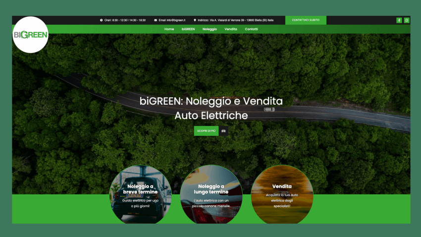 Per biGREEN, negozio di vendita e noleggio di auto elettriche di Biella, abbiamo realizzato il loro primo sito web.La nostra soluzione:Un sito vetrina per la start-up appena lanciata, in cui ci fosse la possibilità di richiesta preventivi.