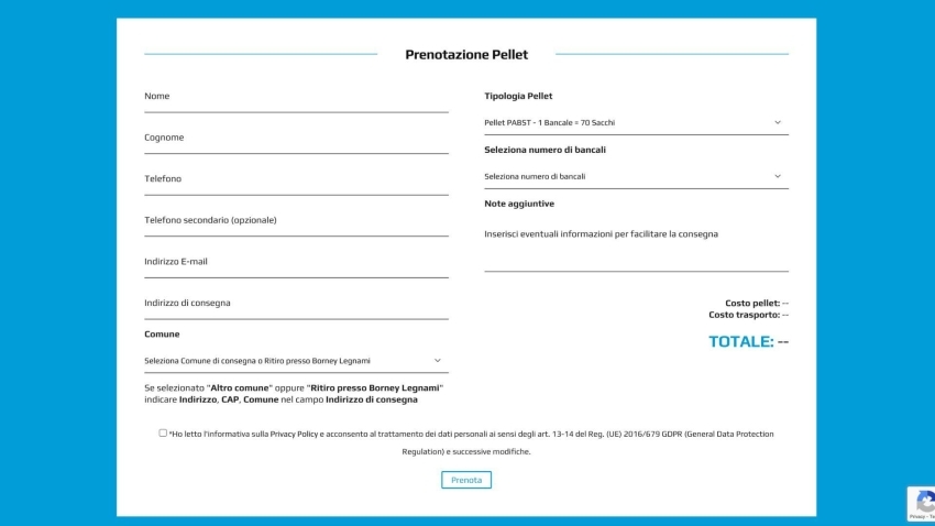 Il modulo pellet è un esempio di come il progetto sia stato pensato per rispondere alle esigenze specifiche di Borney Legnami. Questo strumento permette infatti di gestire in modo autonomo, semplice e dinamico la disponibilità e i prezzi dei diversi tipi di pellet, oltre a calcolare i costi di spedizione in base al comune di destinazione, offrendo ai clienti un servizio efficiente e trasparente.