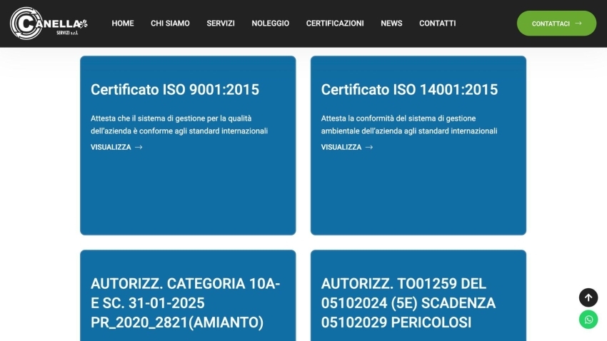 La trasparenza e l’affidabilità dell’azienda sono ulteriormente rafforzate dalla sezione “Certificazioni e Autorizzazioni”, una pagina dedicata dove è possibile visualizzare e scaricare la documentazione ufficiale.