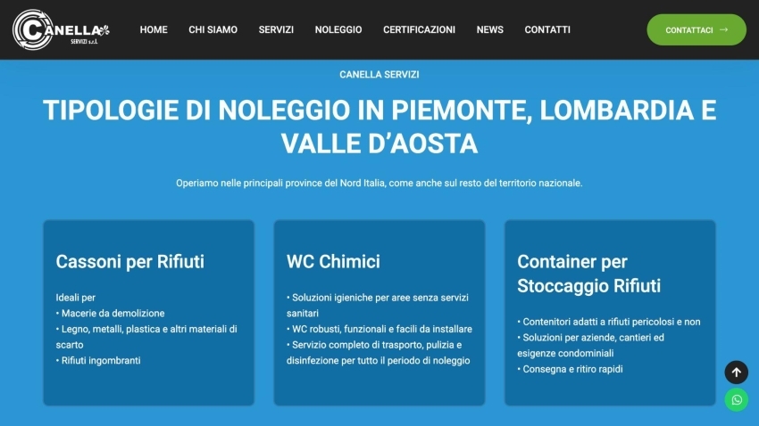 Un’attenzione particolare è stata riservata alla sezione “Noleggio”, evidenziata in modo indipendente per sottolineare la possibilità di noleggiare una vasta gamma di attrezzature, tra cui cassoni, container e WC chimici.