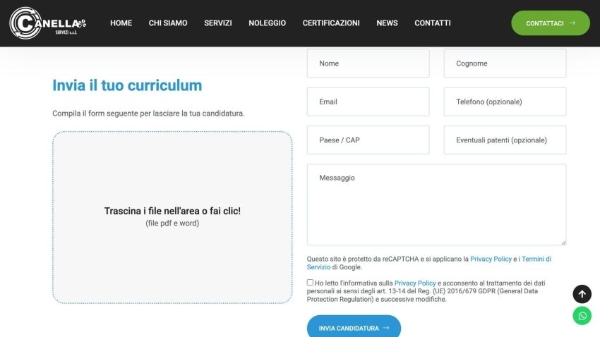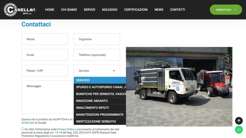 La comunicazione con Canella Servizi è resa immediata grazie al widget WhatsApp integrato, che permette un contatto veloce e diretto. Inoltre, un form contatti completo offre la possibilità di selezionare il servizio specifico per il quale si desidera ricevere maggiori informazioni, ottimizzando così la gestione delle richieste.