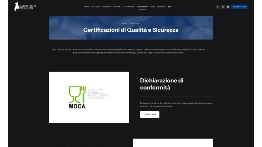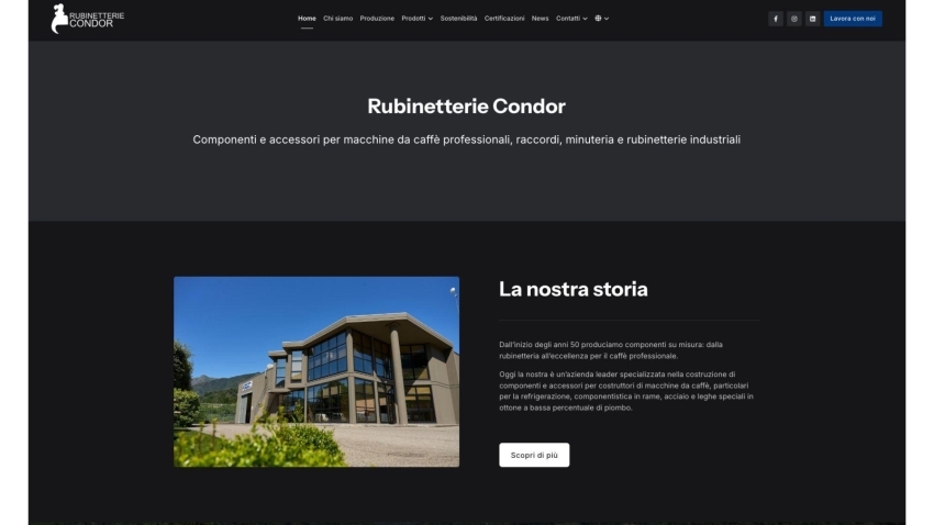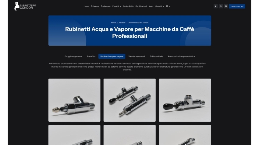 Abbiamo accolto questa visione sviluppando un sito dall'identità visiva forte e memorabile. Ha vinto un design "dark", dove lo sfondo grigio scuro esalta per contrasto la brillantezza delle finiture dei prodotti e permette a Rubinetterie Condor di confermare il proprio impegno nella sostenibilità digitale.