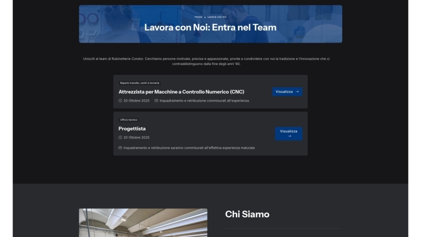 Oltre all'impatto visivo, il progetto è stato ottimizzato in ottica SEO e studiato per una navigazione concreta e funzionale, capace di guidare l’utente alla scoperta dei dettagli di ogni categoria prodotto. Inoltre, per supportare la visione di crescita attraverso le persone, abbiamo integrato un modulo candidature personalizzato che permette all'ufficio HR di gestire in totale autonomia l'intero flusso di recruiting.