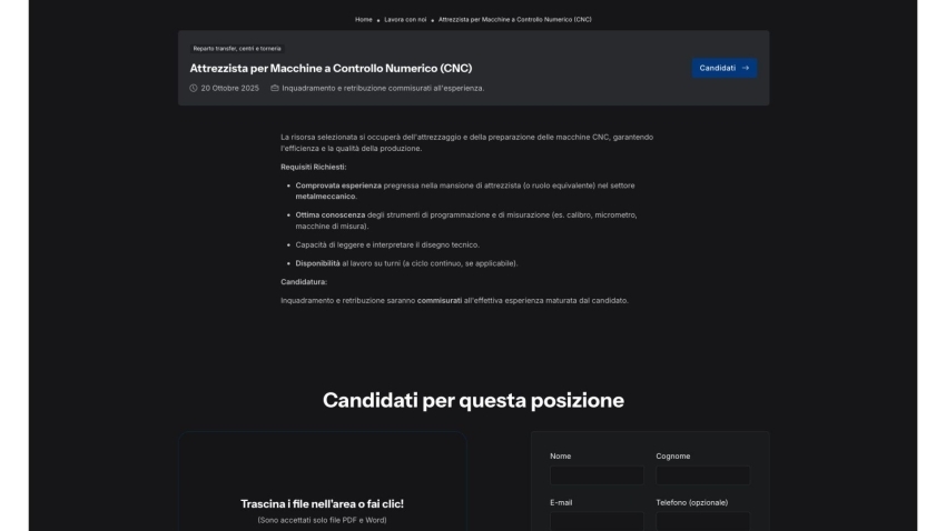 L'introduzione del modulo per le candidature è uno strumento mirato a ottimizzare i futuri processi di recruiting, trasformando il progetto in una risorsa attiva per attrarre i migliori talenti. Il risultato finale è una piattaforma che non solo ha rinnovato l'estetica del brand, ma ha anche posto le basi per potenziarne gli strumenti operativi, dimostrando come un design d'impatto e una funzionalità mirata possano lavorare in sinergia per raggiungere obiettivi di crescita a lungo termine.