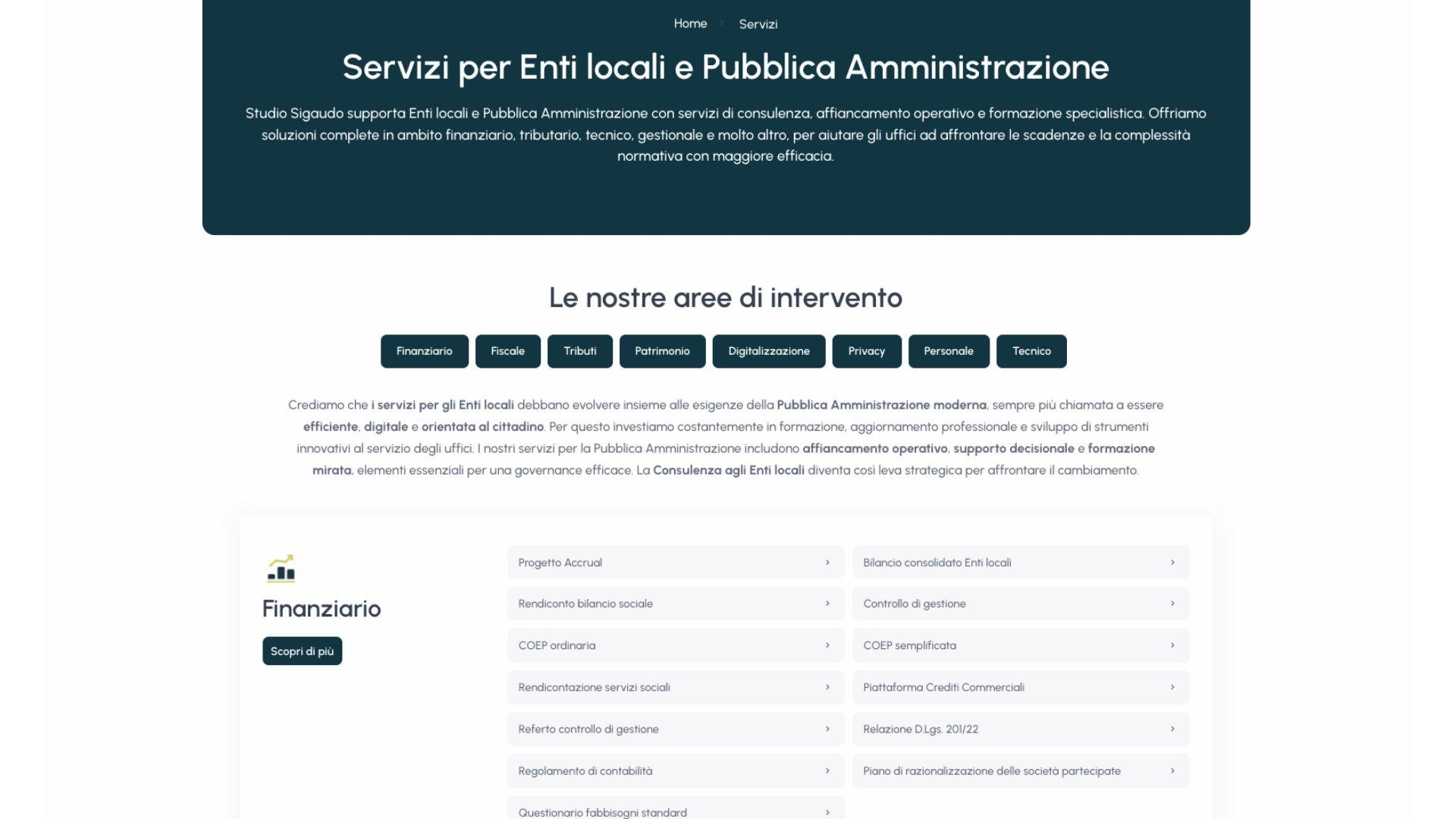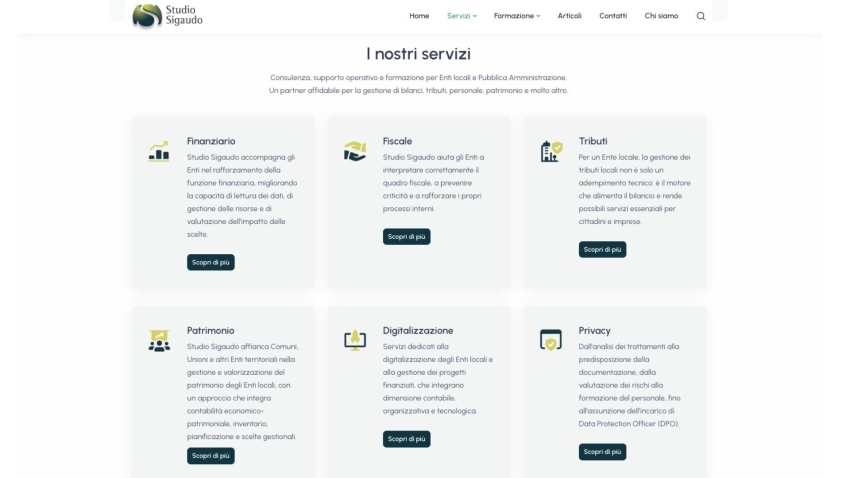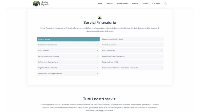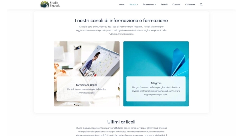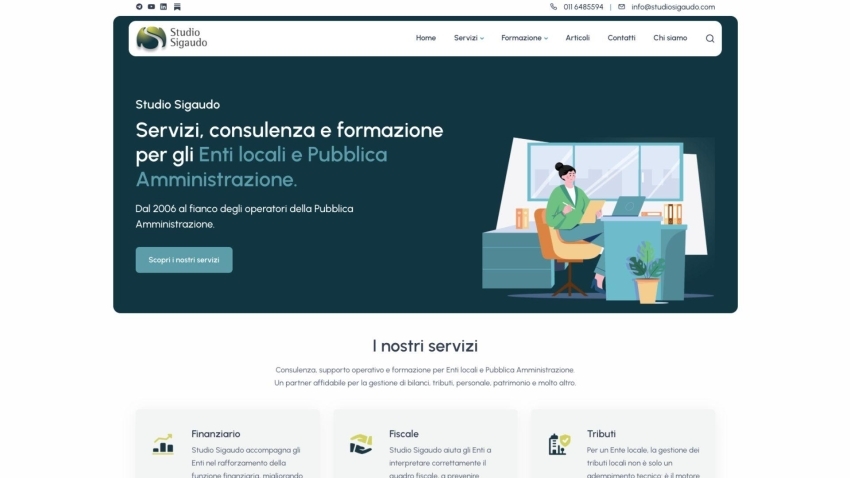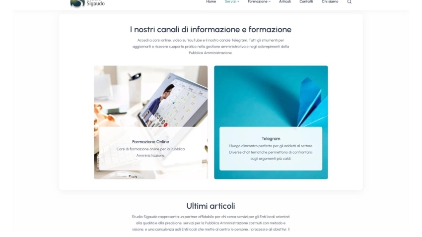 Studio Sigaudo si occupa di consulenza e formazione rivolta alla Pubblica Amministrazione. Grazie a una produzione costante di contenuti informativi, corsi di aggiornamento e servizi specialistici, lo Studio necessitava di un ecosistema digitale evoluto, capace di gestire una mole di dati imponente e di facilitare l’interazione quotidiana con gli enti locali.