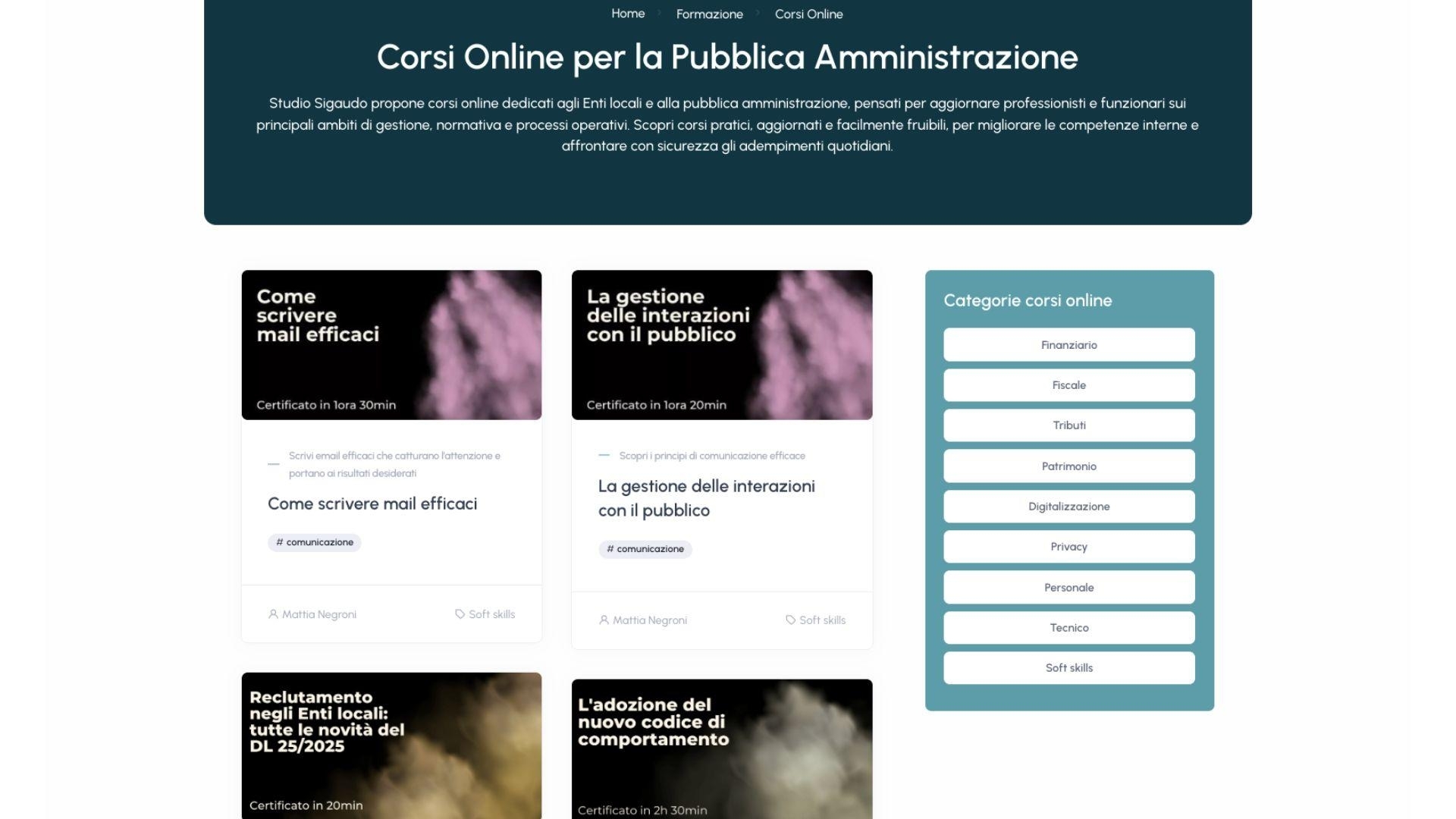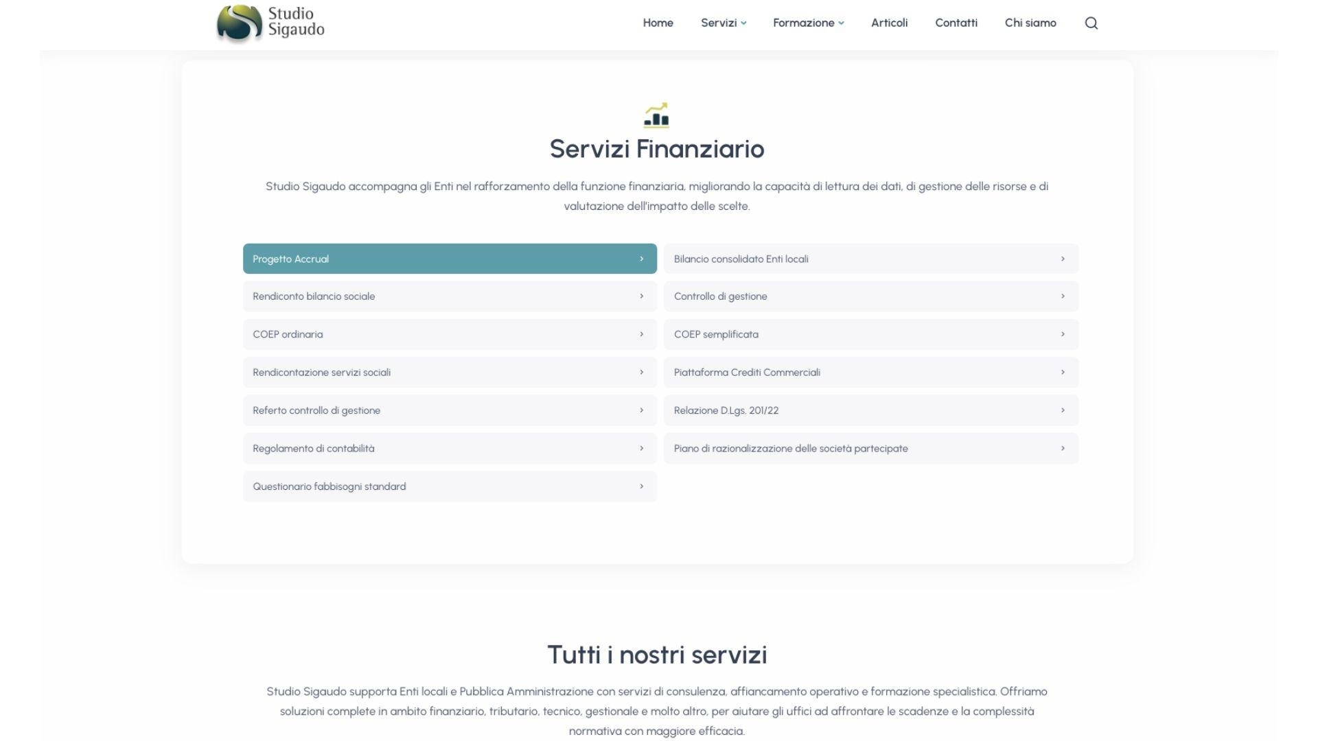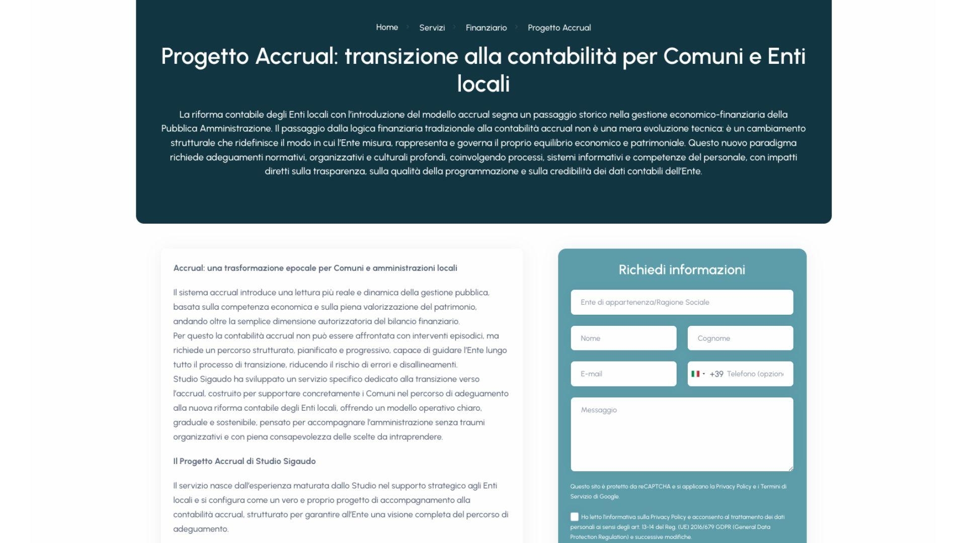Studio Sigaudo si occupa di consulenza e formazione rivolta alla Pubblica Amministrazione. Grazie a una produzione costante di contenuti informativi, corsi di aggiornamento e servizi specialistici, lo Studio necessitava di un ecosistema digitale evoluto, capace di gestire una mole di dati imponente e di facilitare l’interazione quotidiana con gli enti locali.